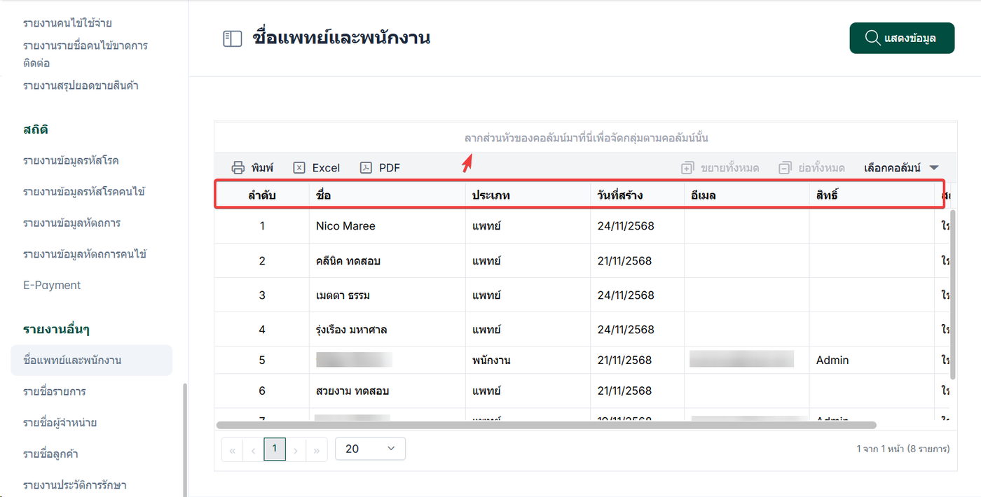 ผู้ใช้งานสามารถลากส่วนหัวของคอลัมน์เพื่อจัดตามกลุ่มของคอลัมน์ได้