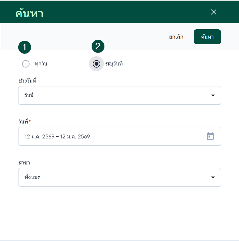 เลือก ระบุวันที่ ผู้ใช้งานสามารถเลือกช่วงวันที่ได้หลายรูปแบบ เช่น
