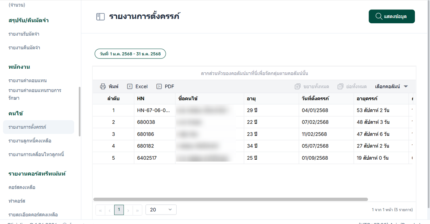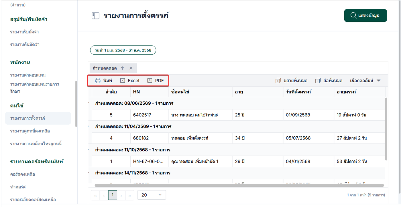รายงานการตั้งครรภ์ คือรายงานที่ใช้สำหรับ สรุปข้อมูลการตั้งครรภ์ของผู้รับบริการ โดยรวบรวมข้อมูลที่เกี่ยวข้องและแสดงออกมาในรูปแบบรายงาน ตรวจสอบข้อมูลผู้รับบริการที่อยู่ในช่วงตั้งครรภ์,ติดตามความคืบหน้าและประวัติการดูแลระหว่างตั้งครรภ์,ใช้เป็นข้อมูลประกอบการวางแผนการดูแลและการให้บริการทางการแพทย์ เป็นต้น