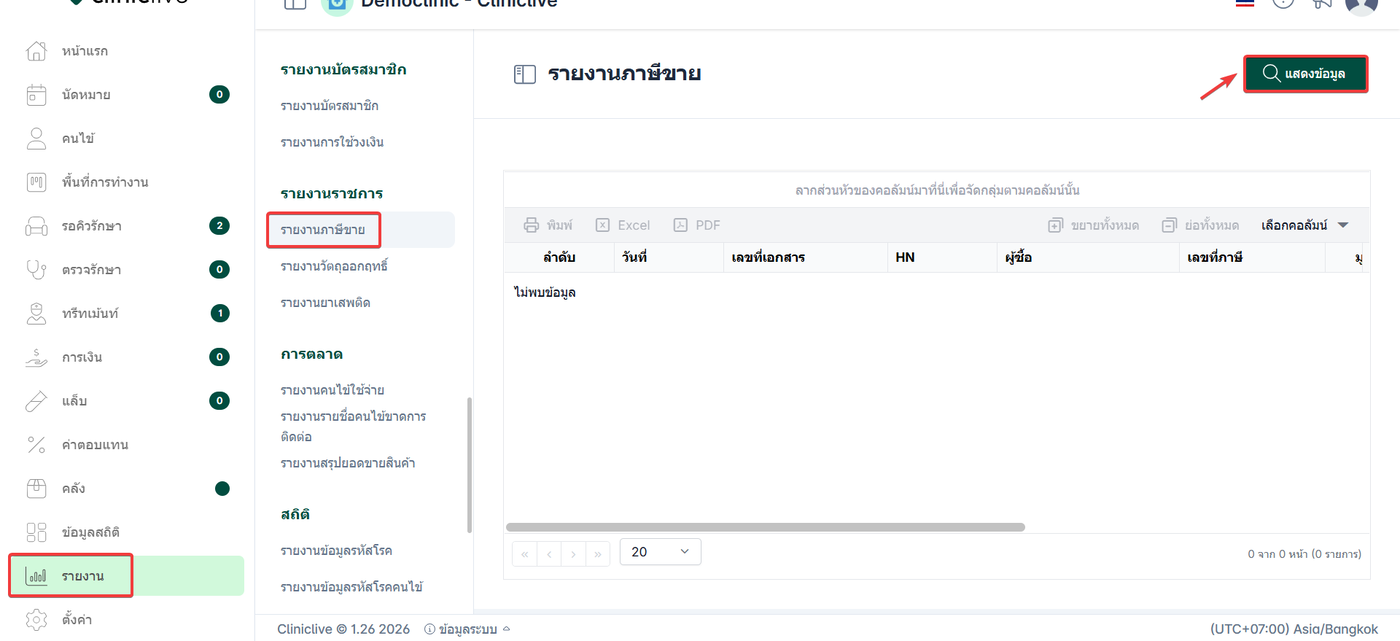 หลังจากเข้าสู่หน้ารายงาน ให้คลิก ไอคอนค้นหา หรือปุ่ม แสดงข้อมูล เพื่อกำหนดเงื่อนไขในการค้นหา