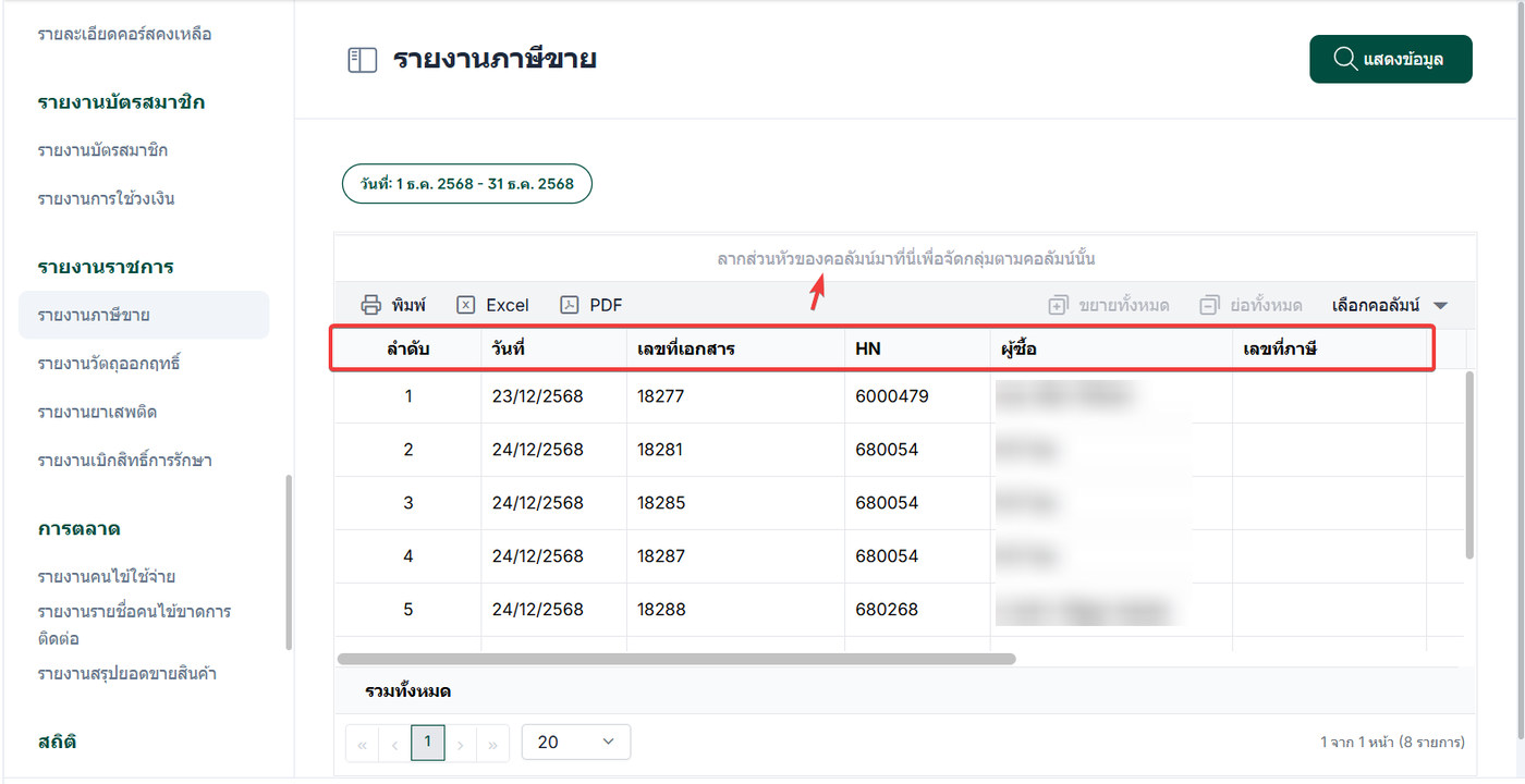 ผู้ใช้งานสามารถลากส่วนหัวของคอลัมน์เพื่อจัดตามกลุ่มของคอลัมน์ได้