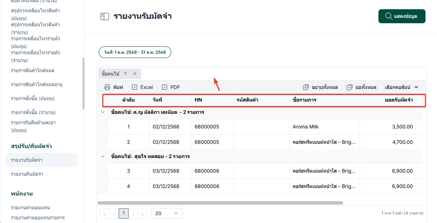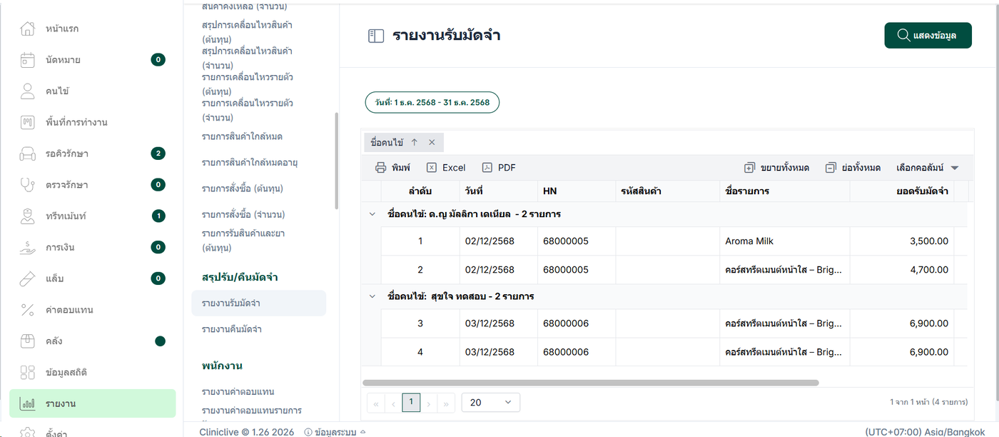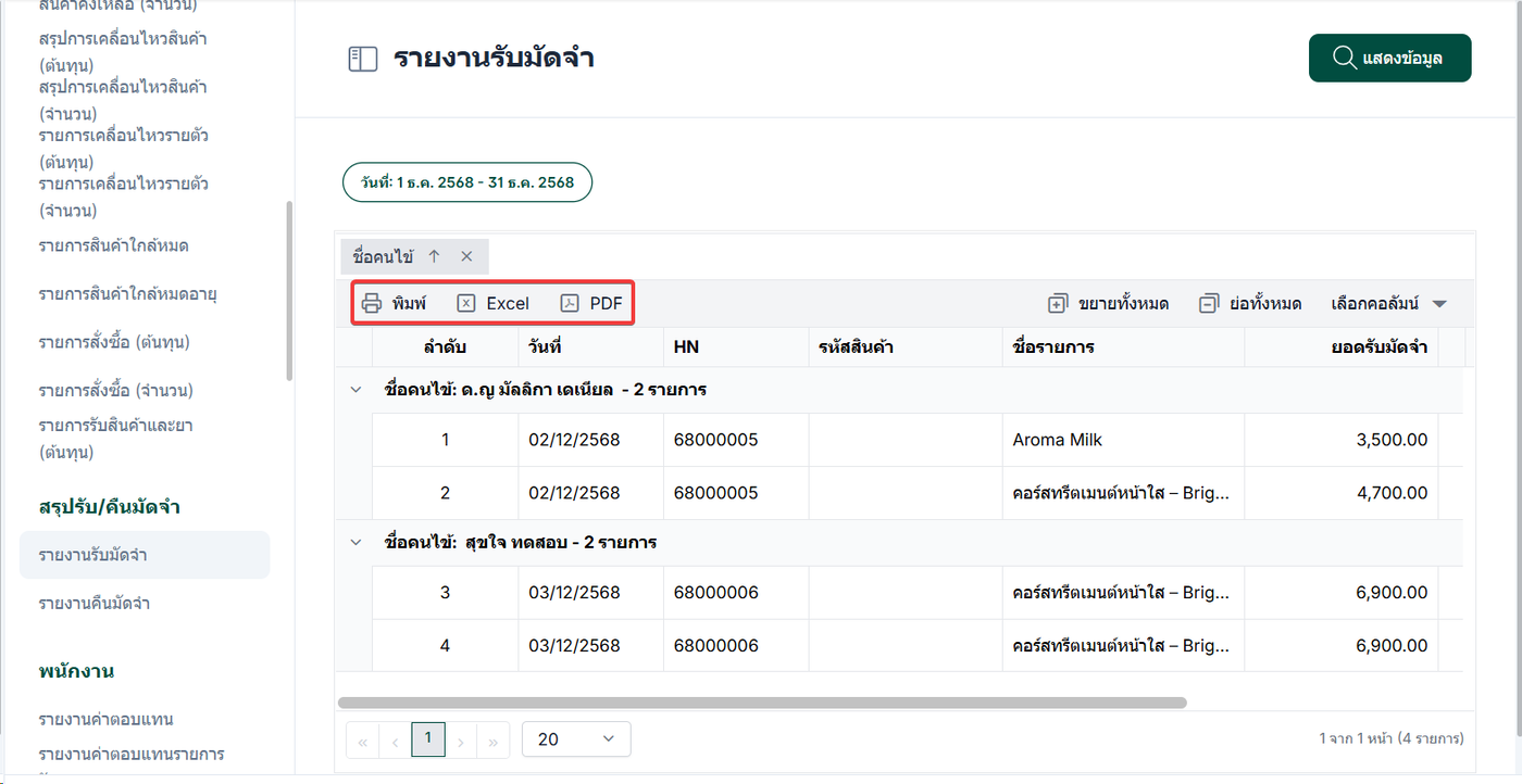 รายงานรับมัดจำ คือรายงานที่ใช้สำหรับ สรุปข้อมูลการรับเงินมัดจำจากผู้รับบริการ โดยแสดงรายละเอียดการรับมัดจำทั้งหมดในรูปแบบรายงาน เพื่อให้สามารถตรวจสอบ ติดตาม และบริหารจัดการข้อมูลทางการเงินได้อย่างเป็นระบบ