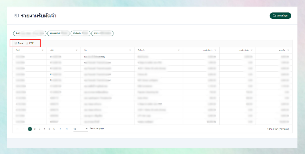 รายงานรับมัดจำ เป็นการสรุปข้อมูลการรับมัดจำไว้ในรูปแบบรายงาน โดยในหน้ารายงานจะมีข้อมูลวันที่ รหัส ชื่อ ชื่อสินค้า ยอดรับมัดจำ ยอดคืนมัดจำ และคงเหลือ จึงทำให้สามารถดูข้อมูลได้ง่ายขึ้น และการเข้าดูข้อมูลรายงานสามารถทำได้โดยการ คลิกแสดงข้อมูล