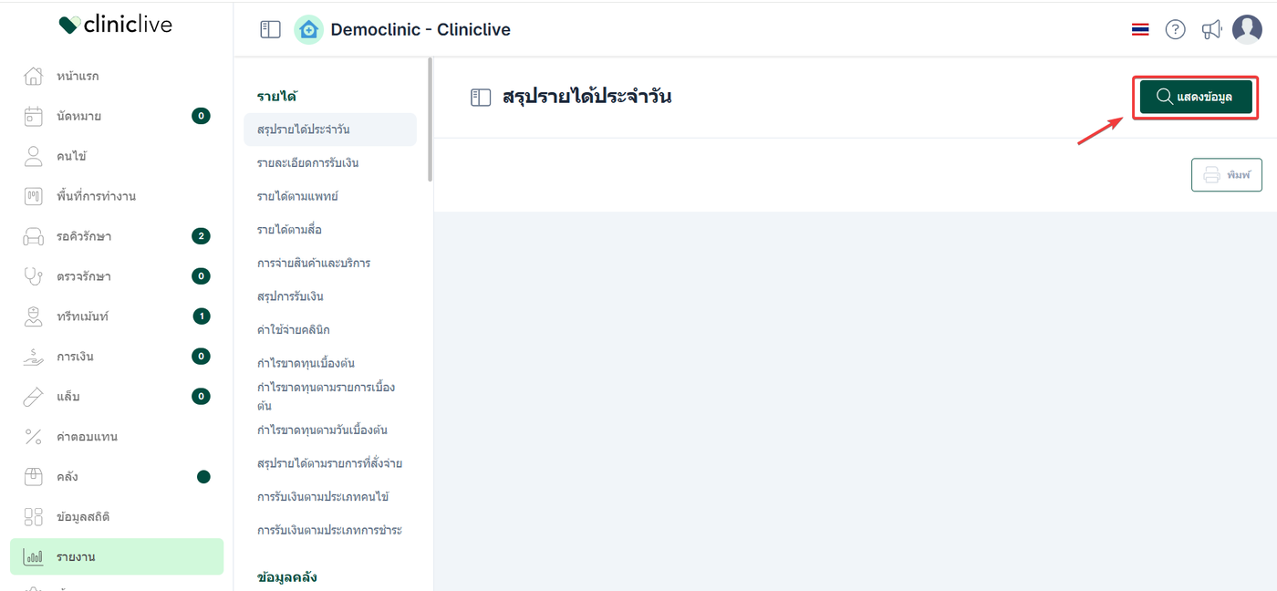 เมื่อเข้าสู่ หน้ารายงานสรุปรายได้ประจำวัน ระบบจะแสดงหน้าจอสำหรับการเรียกดูรายงาน ให้ผู้ใช้งานคลิกปุ่ม แสดงข้อมูล เพื่อทำการเลือกเงื่อนไขก่อนแสดงรายงาน