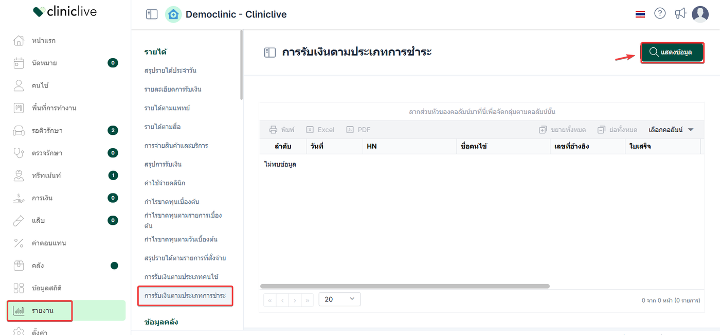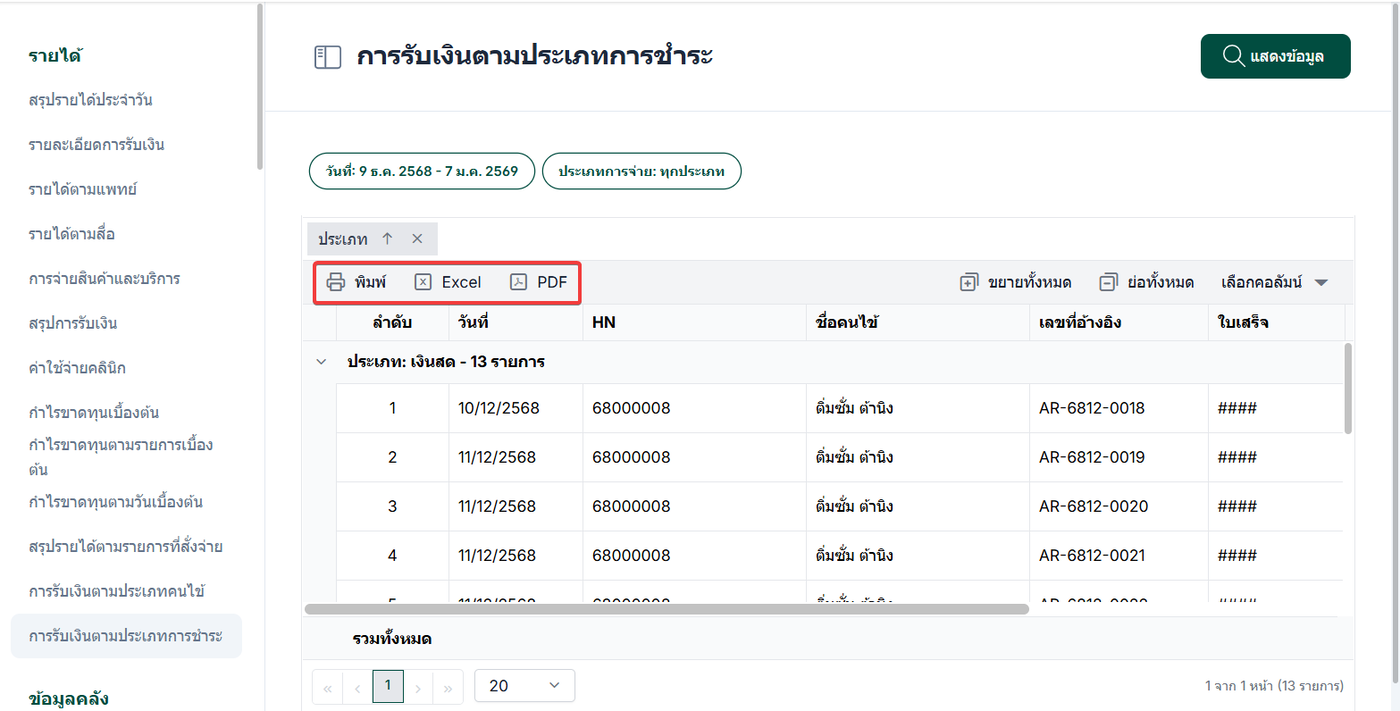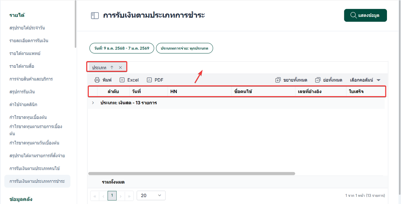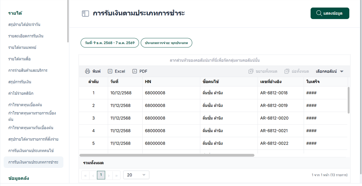 การรับเงินตามประเภทการชำระ เป็นรายงานที่แสดงรายละเอียดการรับชำระเงินของคนไข้ โดยจำแนกข้อมูลตาม ประเภทช่องทางการชำระเงิน ที่ถูกเลือกและบันทึกไว้ในขั้นตอนการรับชำระ รายงานนี้จะแสดงข้อมูลตามช่องทางการชำระเงินที่ใช้จริง เช่น เงินสด บัตรเครดิต เงินโอน / E-Payment คูปอง