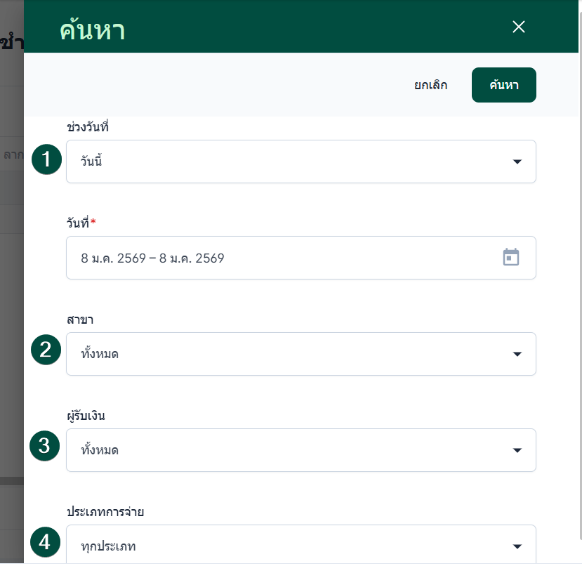 เมื่อกำหนดเงื่อนไขครบถ้วนแล้ว ผู้ใช้งานสามารถคลิก ค้นหา เพื่อแสดงผลรายงานตามข้อมูลที่เลือกไว้