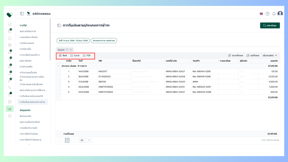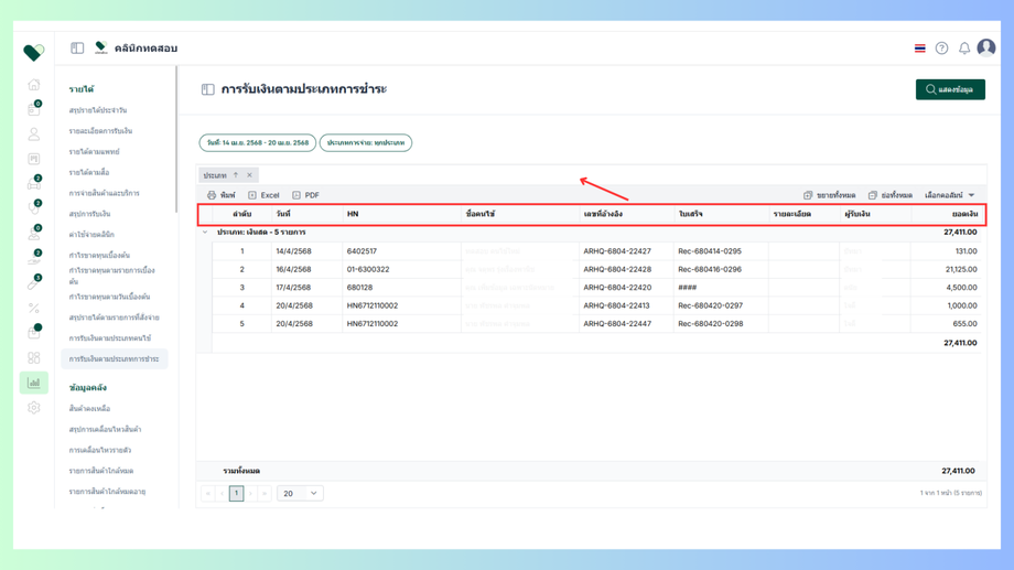 - เลือกหัวข้อรายได้ > การรับเงินตามประเภทการชำระ