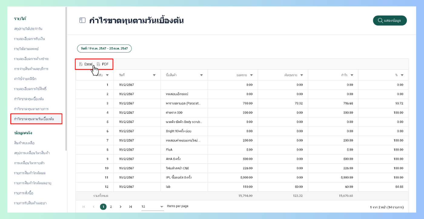 ระบบจะแสดงข้อมูลกำไรขาดทุนตามวันเบื้องต้น สามารถพิมพ์เอกสารออกมาได้เป็นไฟล์ Excel และ PDF