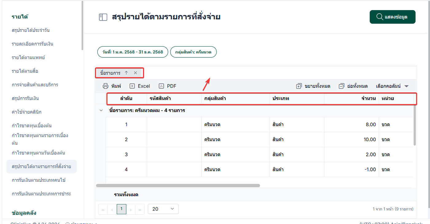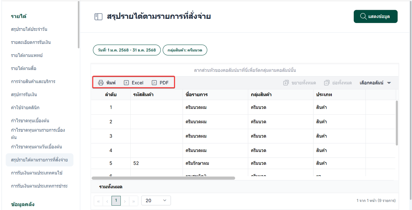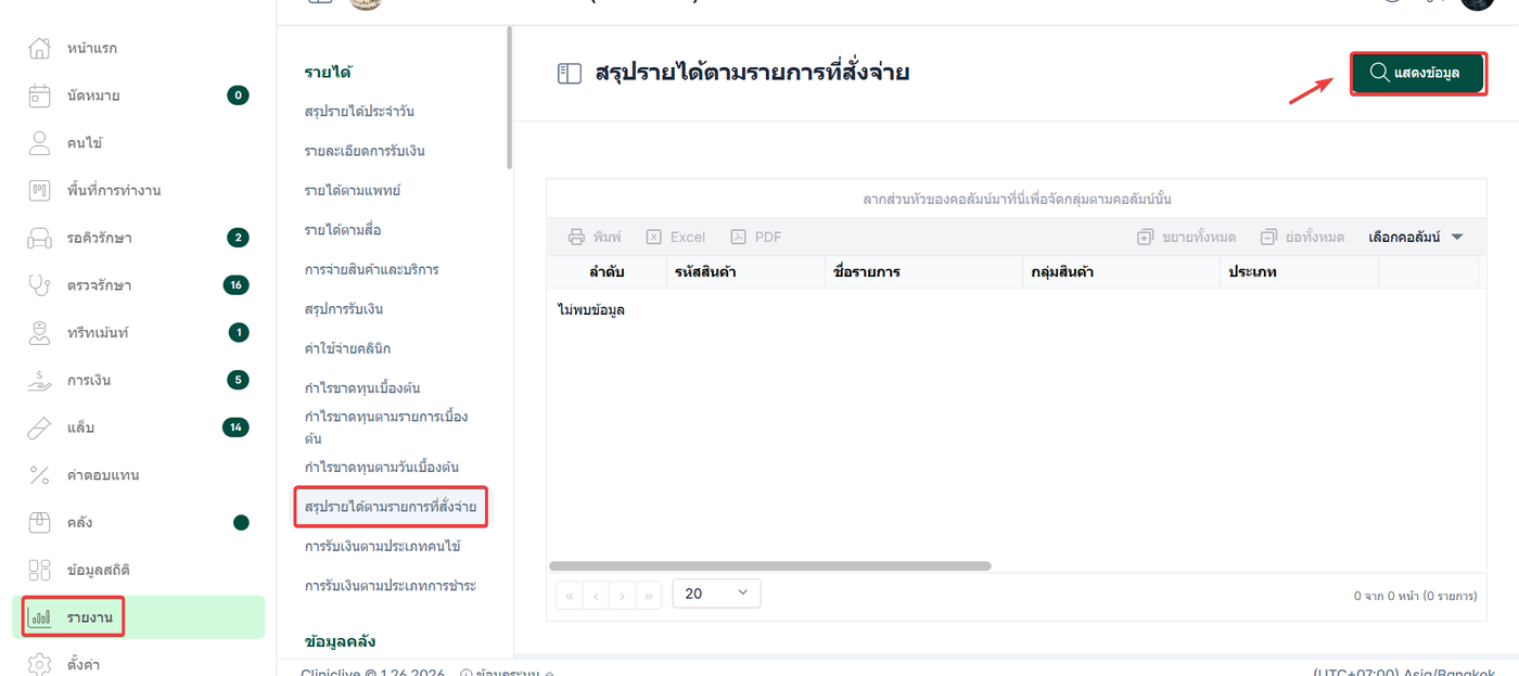 เลือก สรุปรายได้ตามรายการที่สั่งจ่าย