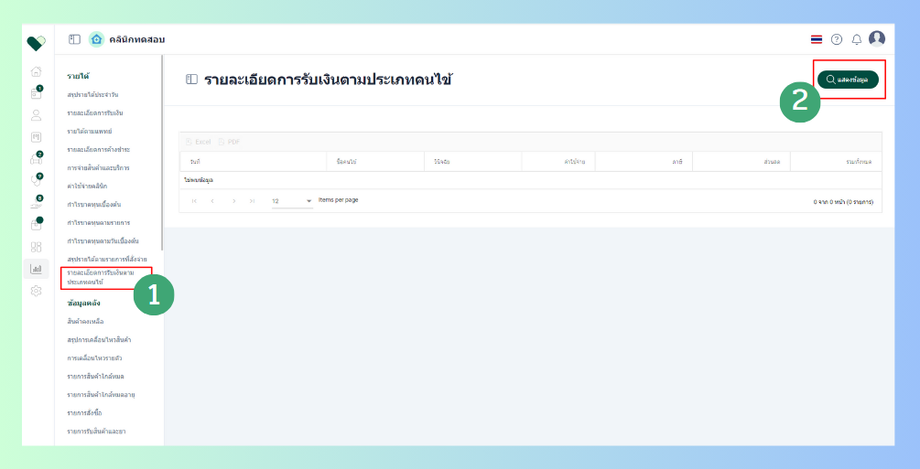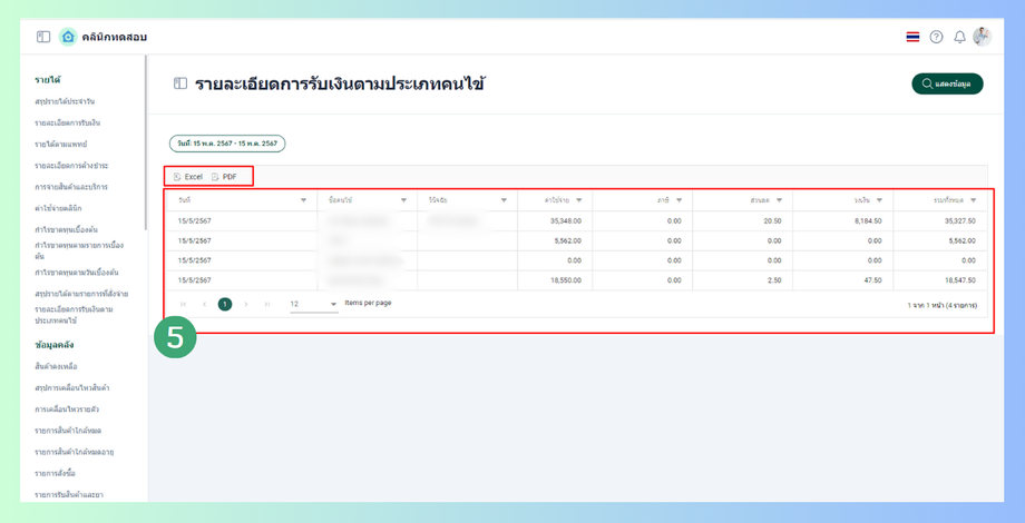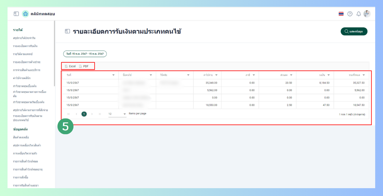รายละเอียดการรับเงินตามประเภทคนไข้ สามารถดูข้อมูลรายละเอียดการรับเงินตามประเภทคนไข้ได้โดยการเลือก รายละเอียดการรับเงินตามประเภทคนไข้ อยู่ในหมวดของ รายได้คลิกที่แสดงข้อมูล เลือกช่วงวันที่ วันที่ และเลือกประเภทลูกค้าคลิกที่ค้นหาโดยจะแสดงรายละเอียดการรับเงินตามประเภทคนไข้ ตามที่ผู้ใช้เลือกวันที่และเลือกประเภทลูกค้าข้างต้น และสามารถพิมพ์เอกสารออกมาเป็นไฟล์ Excel และ PDFได้