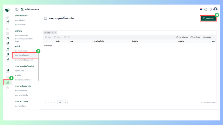 - หัวข้อคนไข้ > เลือกรายงานลูกหนี้คงเหลือ