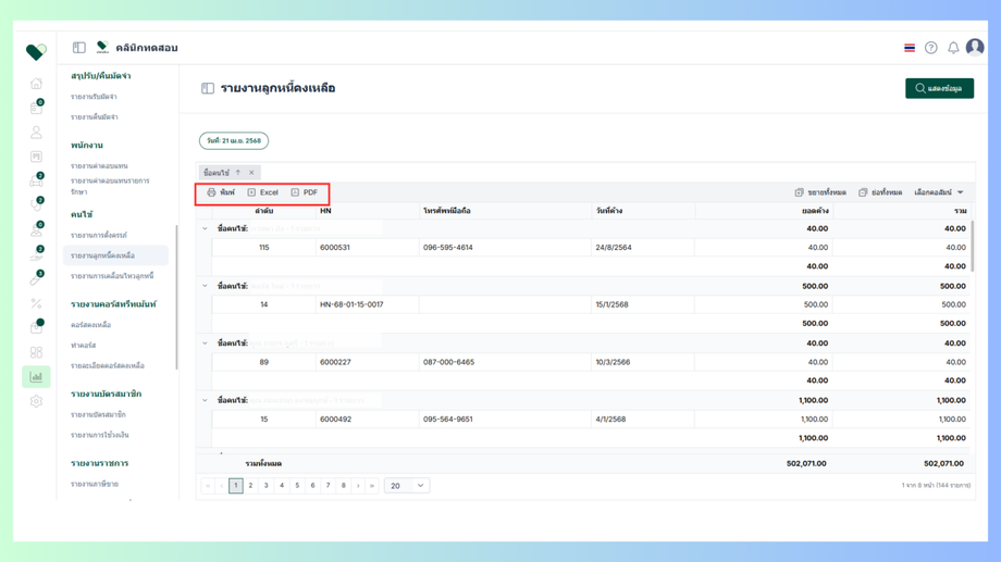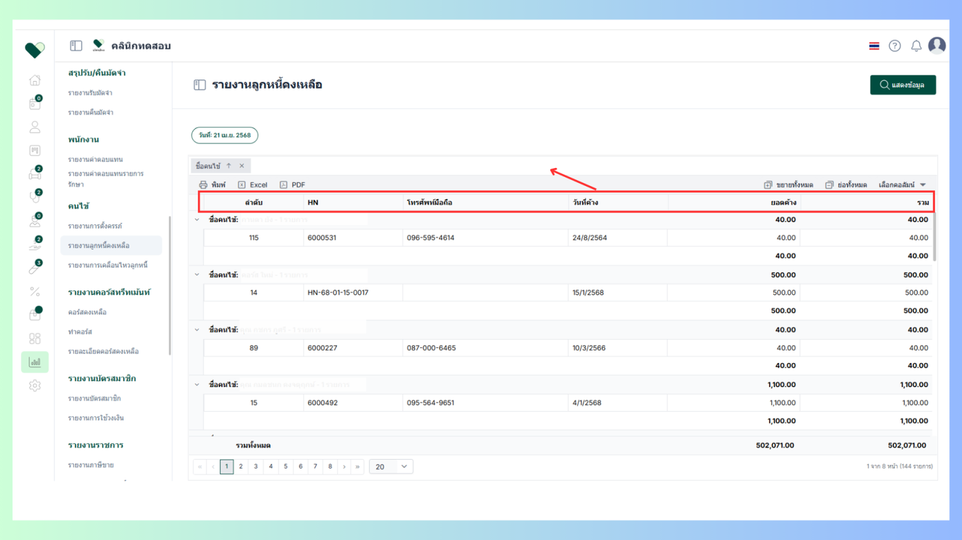 - จากนั้นรายงานจะแสดงรายชื่อคนไข้ที่เป็นยอดค้างชำระขึ้นมา