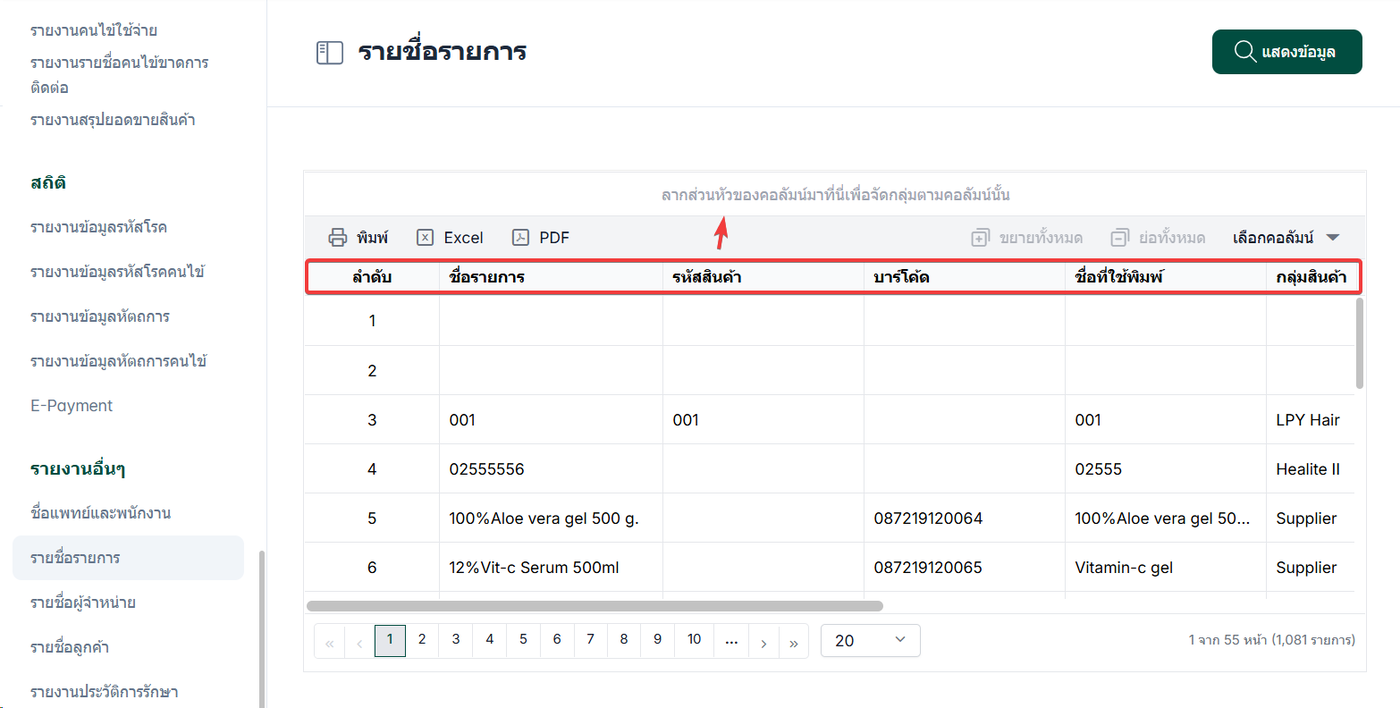 ผู้ใช้งานสามารถลากส่วนหัวของคอลัมน์เพื่อจัดตามกลุ่มของคอลัมน์ได้