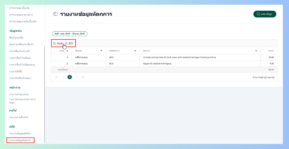 ระบบจะแสดงข้อมูลรายงานข้อมูลหัตถการ สามารถพิมพ์เอกสารออกมาได้เป็นไฟล์ Exel และ PDF