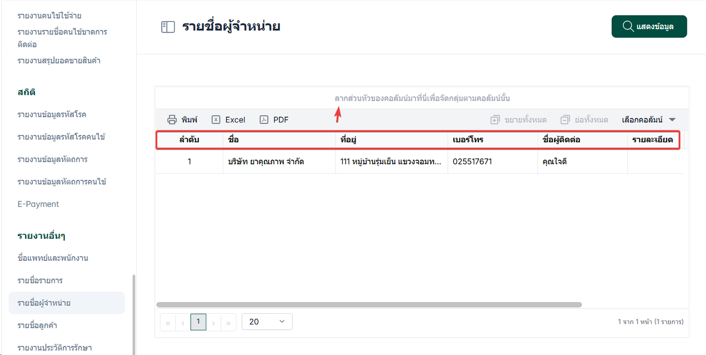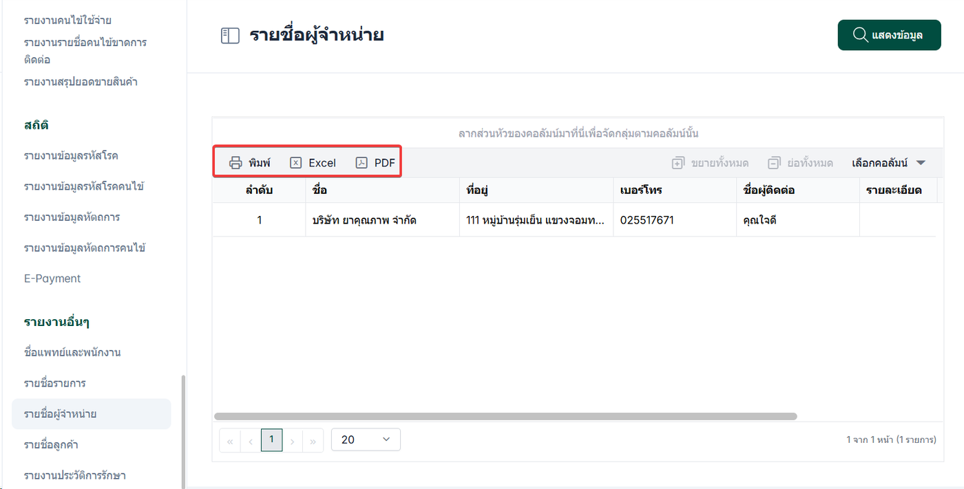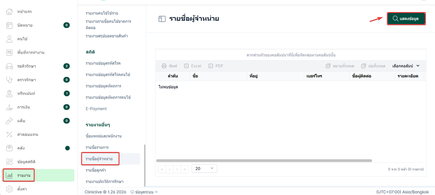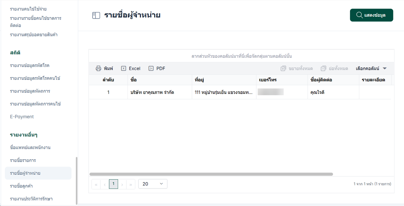 รายงานที่ใช้สำหรับแสดง รายชื่อผู้จำหน่ายที่ได้มีการตั้งค่าและบันทึกไว้ในระบบ ของคลินิก รายงานนี้ช่วยให้ผู้ใช้งานสามารถ