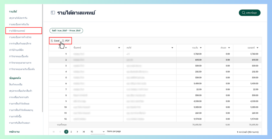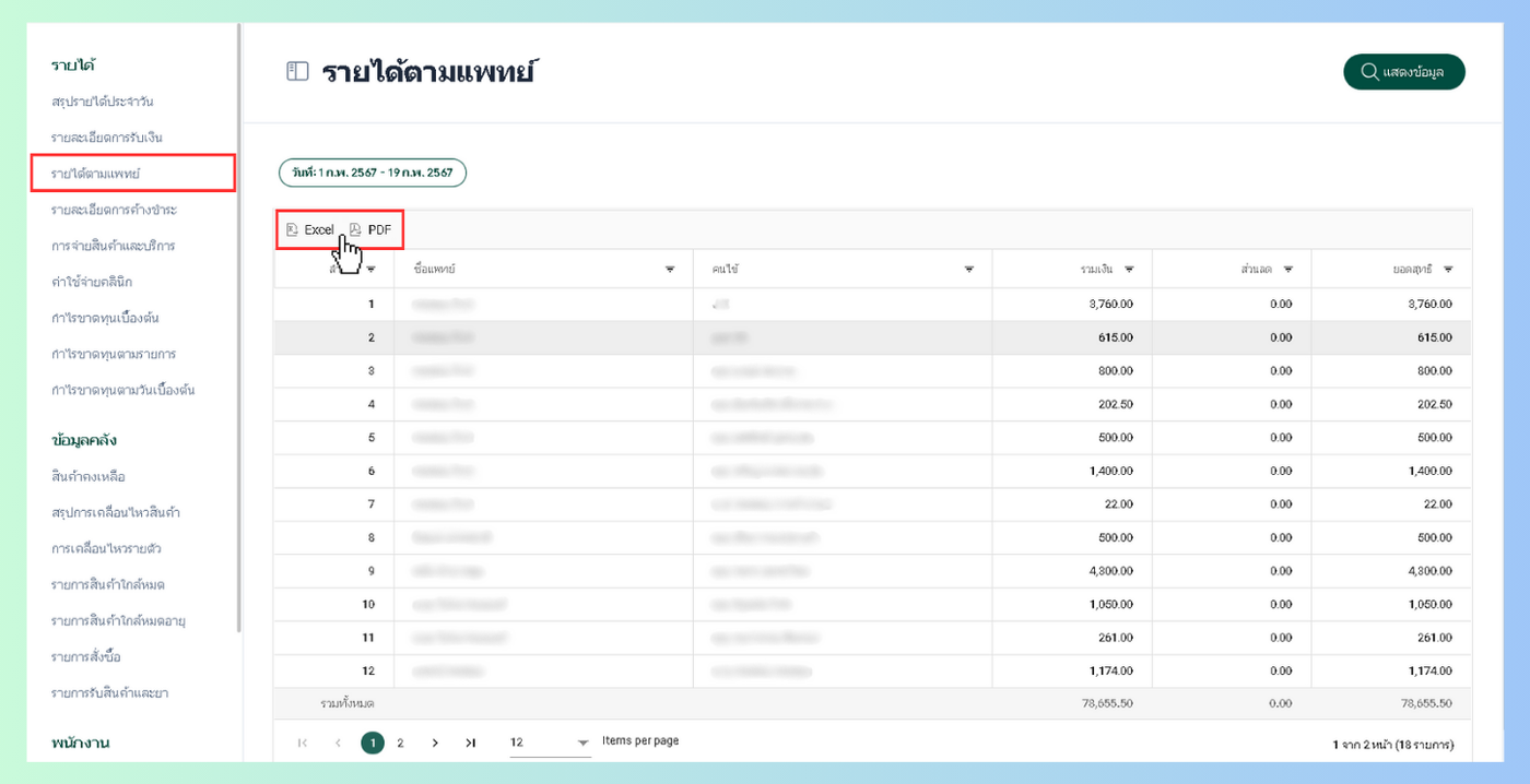 - ระบบจะแสดงข้อมูลรายได้ตามแพทย์ สามารถพิมพ์เอกสารออกมาได้เป็นไฟล์ Excel และ PDF