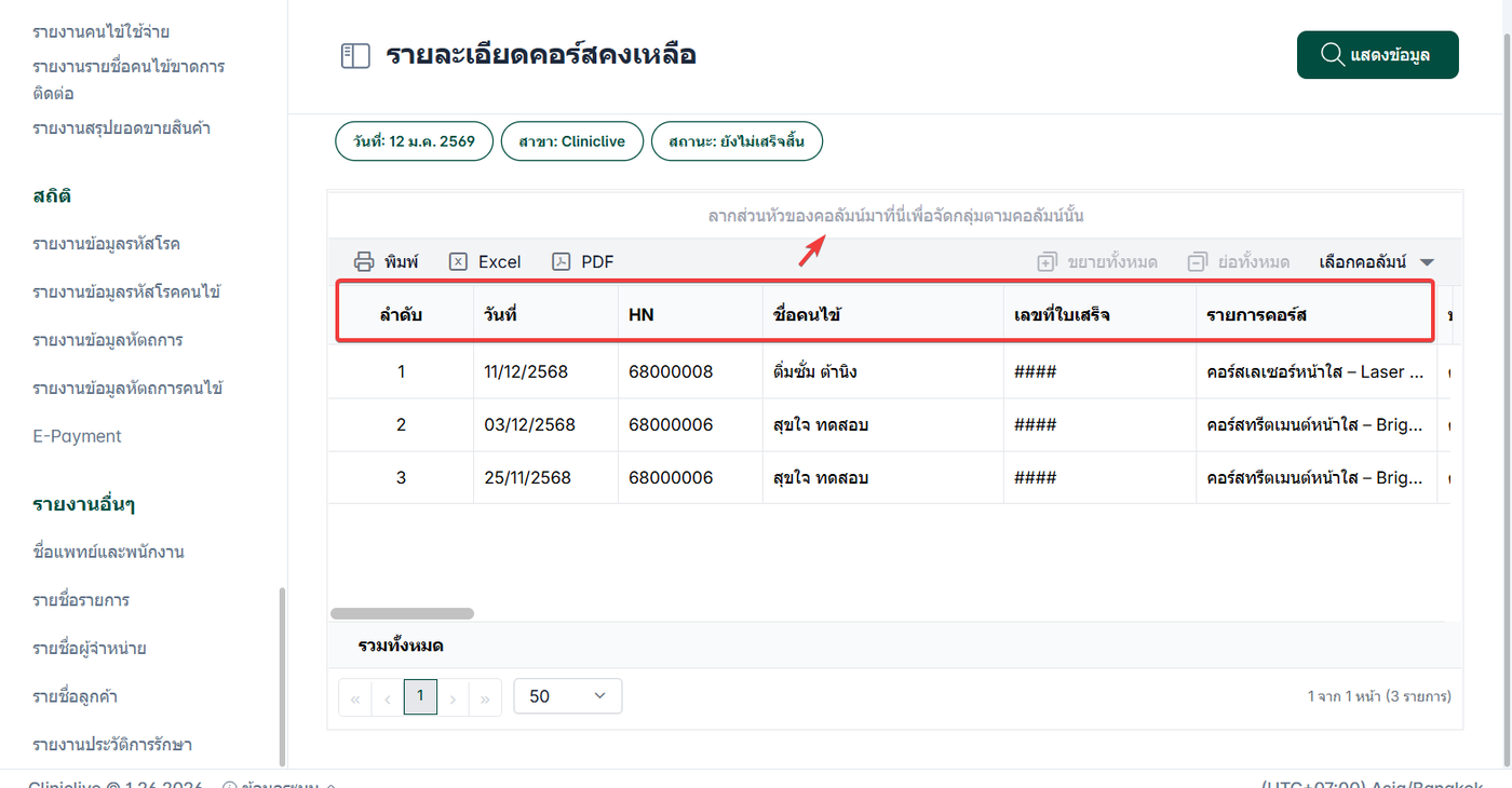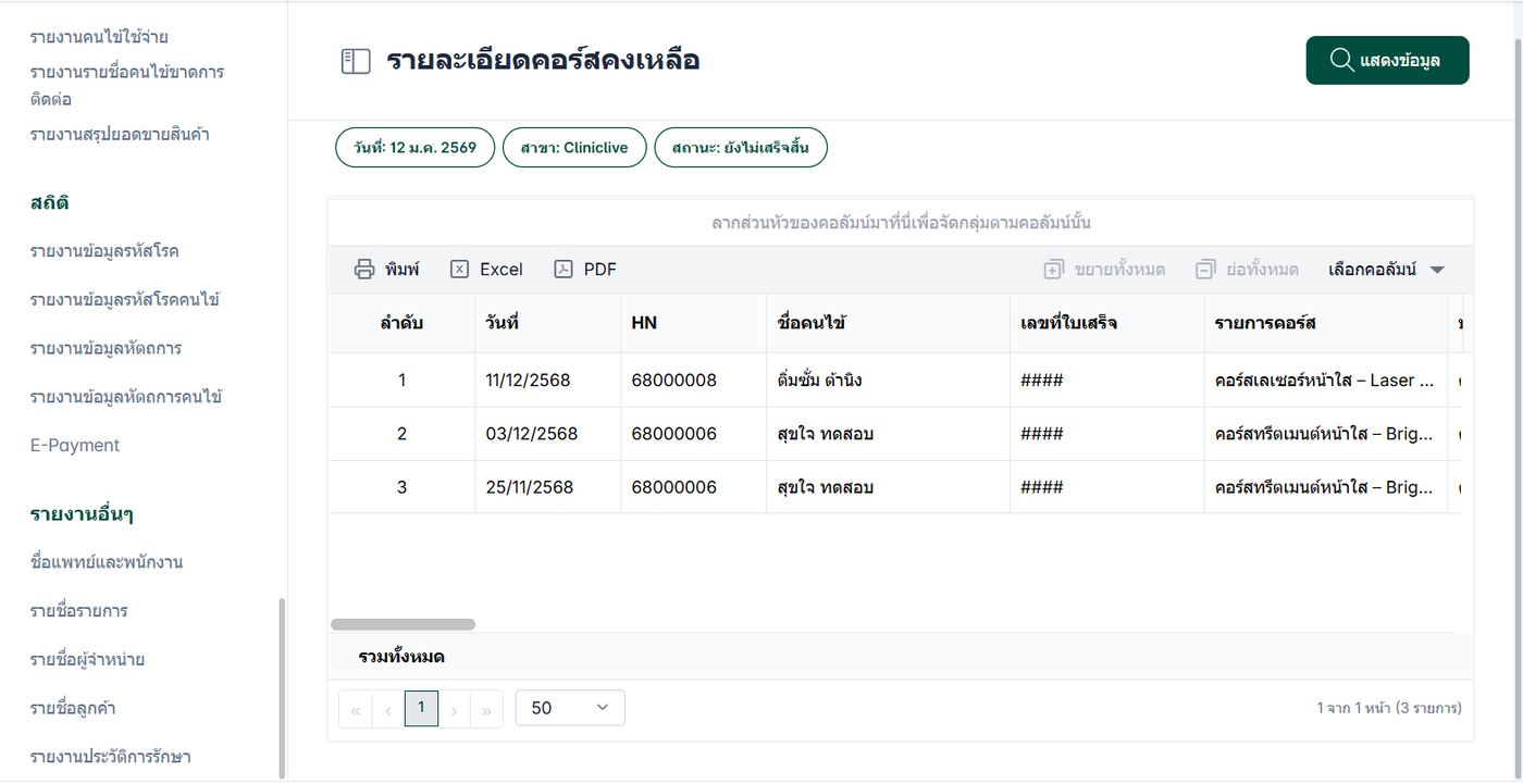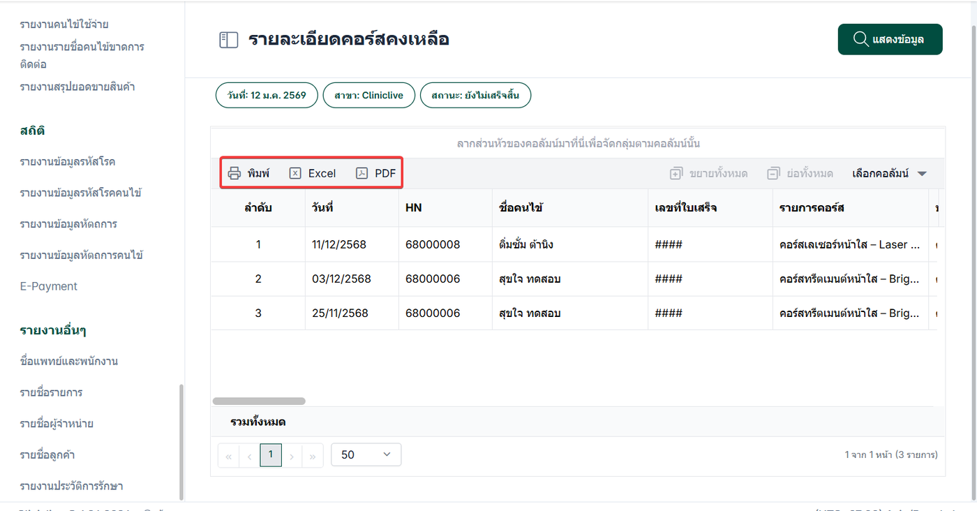 รายละเอียดคอร์สคงเหลือเป็นรายงานที่แสดงข้อมูลสำคัญเกี่ยวกับคอร์สที่คนไข้ยังคงเหลือในระบบของคลินิก รายงานนี้เสริมทำให้ผู้ดูแลระบบหรือเจ้าหน้าที่ทางการแพทย์สามารถติดตามและวิเคราะห์สถานะและข้อมูลที่เกี่ยวข้องกับคอร์สที่คนไข้ยังคงเหลือในระบบ