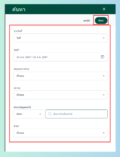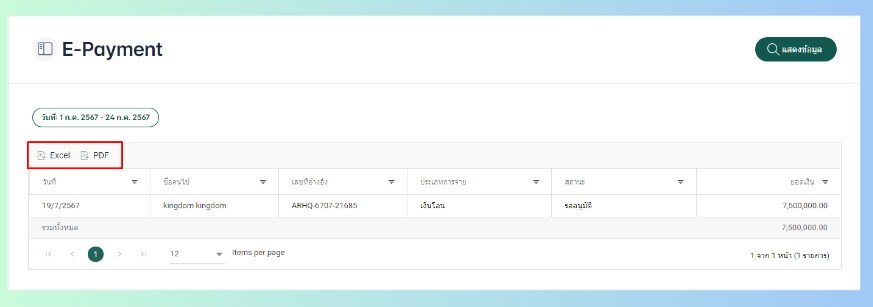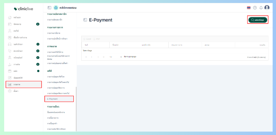 E-Payment 1. รายงาน > E-Payment > แสดงข้อมูล2. กรอกข้อมูลที่ต้องการ ระบบสามารถค้นหาชื่อคนไข้รายคนได้ > กดค้นหา3. ระบบสามารถทำเป็นไฟล์ Excel - PDF ได้