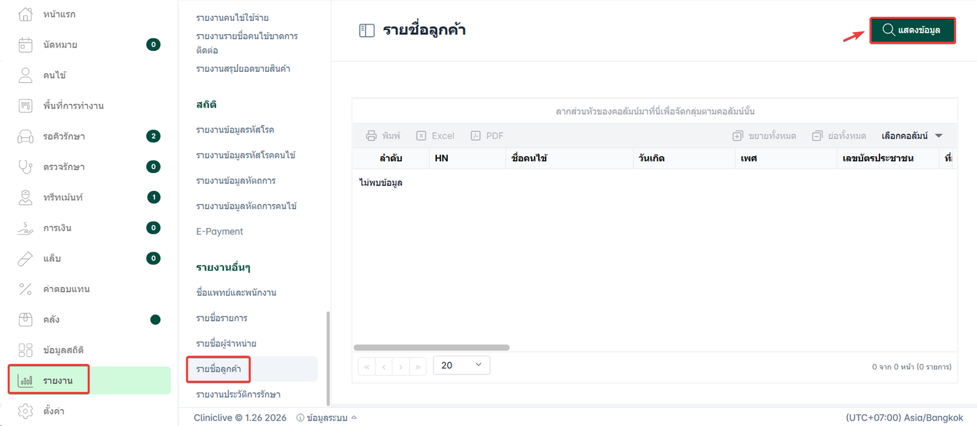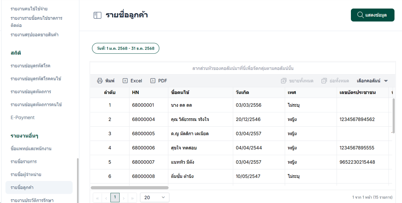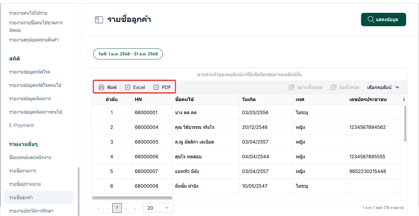 รายงานนี้ช่วยให้ผู้ดูแลระบบหรือเจ้าหน้าที่สามารถตรวจสอบและจัดการข้อมูลรายชื่อลูกค้าที่คลินิกมีได้อย่างมีประสิทธิภาพ
