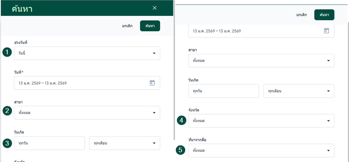 เลือกช่วงวันที่ ผู้ใช้งานสามารถเลือกช่วงวันที่ได้หลายรูปแบบ เช่น
