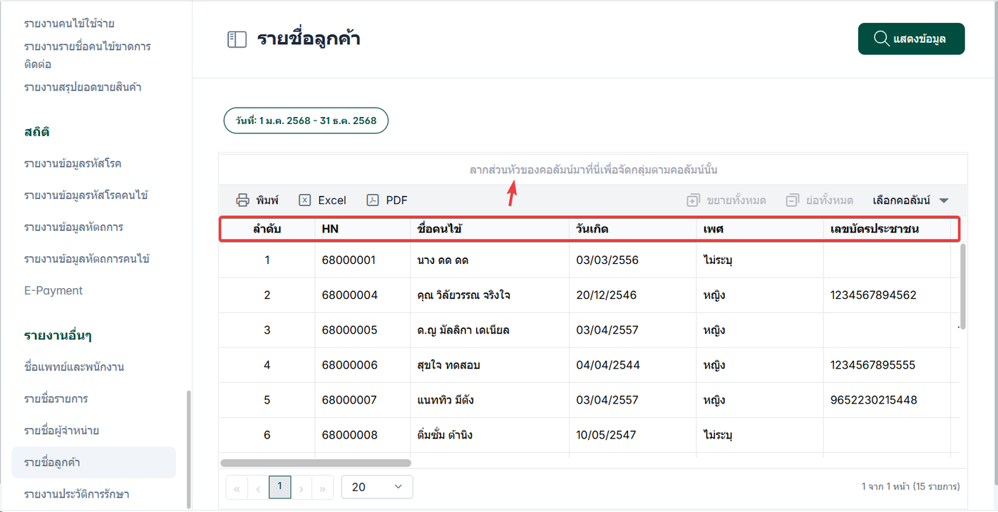 ผู้ใช้งานสามารถลากส่วนหัวของคอลัมน์เพื่อจัดตามกลุ่มของคอลัมน์ได้