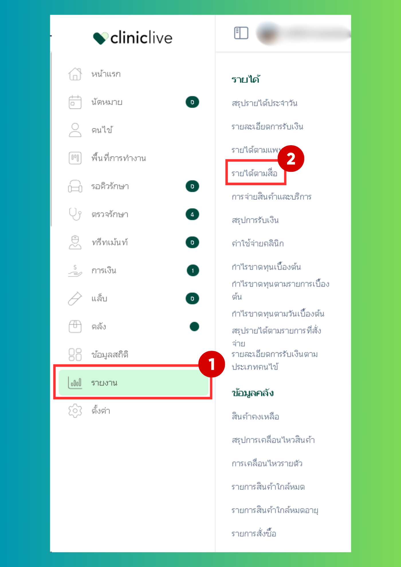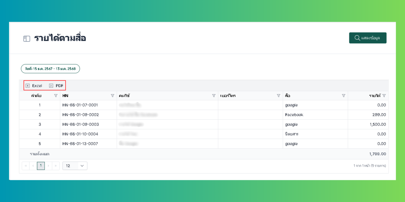 รายงานนี้ จะแสดงรายได้ที่ได้รับจากลูกค้าที่มาจากสื่อต่างๆ โดยสามารถค้นหาตามสื่อที่ต้องการหรือค้นหาทั้งหมดเพื่อแสดงรายได้ที่ได้จากลูกค้า ในช่วงเวลานั้นๆ