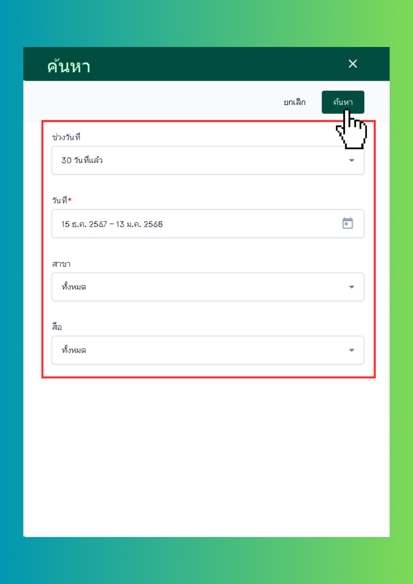 หลังจากคลิกแสดงข้อมูลแล้ว จะมีหน้าต่างค้นหาขึ้นมา ผู้ใช้สามารถเลือกค้นหา ตามช่วงวันที่ วันที่ สาขา และประเภทของสื่อ