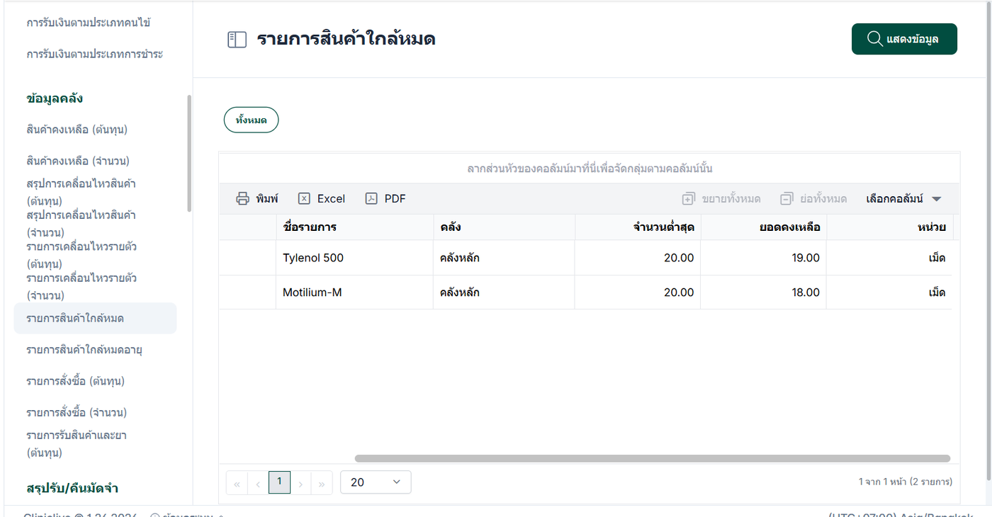 รายการสินค้าใกล้หมด คือรายงานที่ระบบใช้แสดง สินค้าที่มีปริมาณคงเหลือใกล้ถึงจุดต่ำสุด เพื่อแจ้งเตือนให้ผู้ใช้งานสามารถวางแผนจัดการสต็อกได้อย่างเหมาะสม ผู้ใช้งานสามารถ กำหนดจำนวนต่ำสุดของสินค้า ไว้ล่วงหน้าในระบบ เมื่อใดก็ตามที่ปริมาณสินค้าคงเหลือ ลดลงจนถึงหรือ ต่ำกว่าจำนวนต่ำสุดที่ตั้งค่าไว้ สินค้านั้นจะถูกนำมาแสดงในรายงานสินค้าใกล้หมด