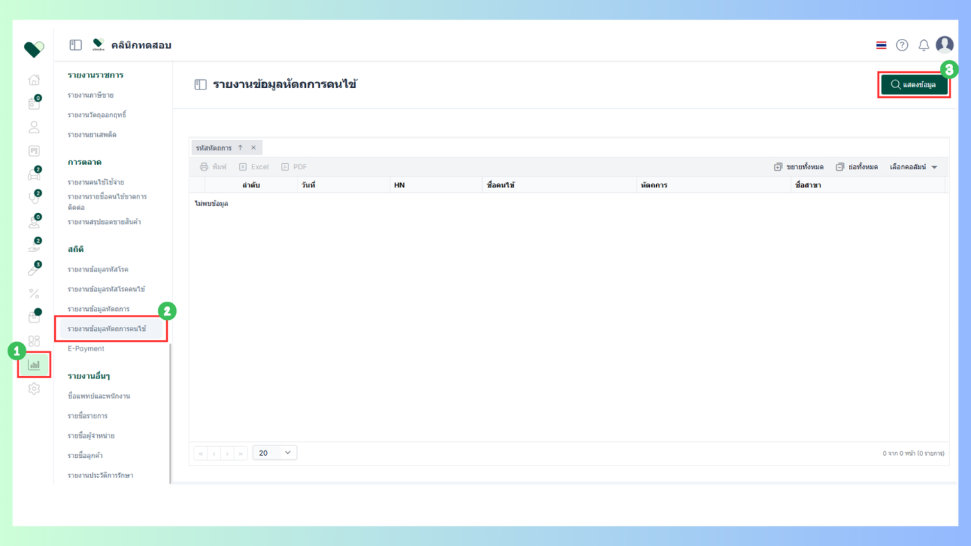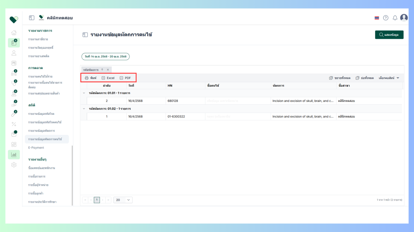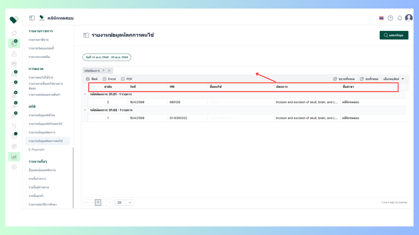 - หัวข้อสถิติ > รายงานข้อมูลหัตถการคนไข้