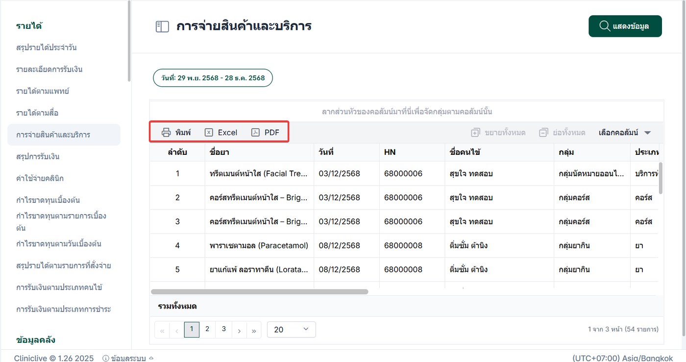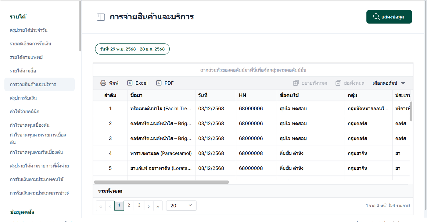 รายงานการจ่ายสินค้าและบริการ หมายถึงรายงานที่แสดงข้อมูลการจ่ายสินค้า ยา และการให้บริการต่าง ๆ แก่ผู้รับบริการ ซึ่งเกิดจากการใช้สินค้าและบริการภายในระบบ หลังจากมีการสั่งรายการและให้บริการเรียบร้อยแล้ว รายงานนี้จะรวบรวมข้อมูลสำคัญเกี่ยวกับการใช้บริการของคนไข้ เพื่อใช้ในการตรวจสอบ วิเคราะห์ และติดตามการจ่ายสินค้าและบริการ
