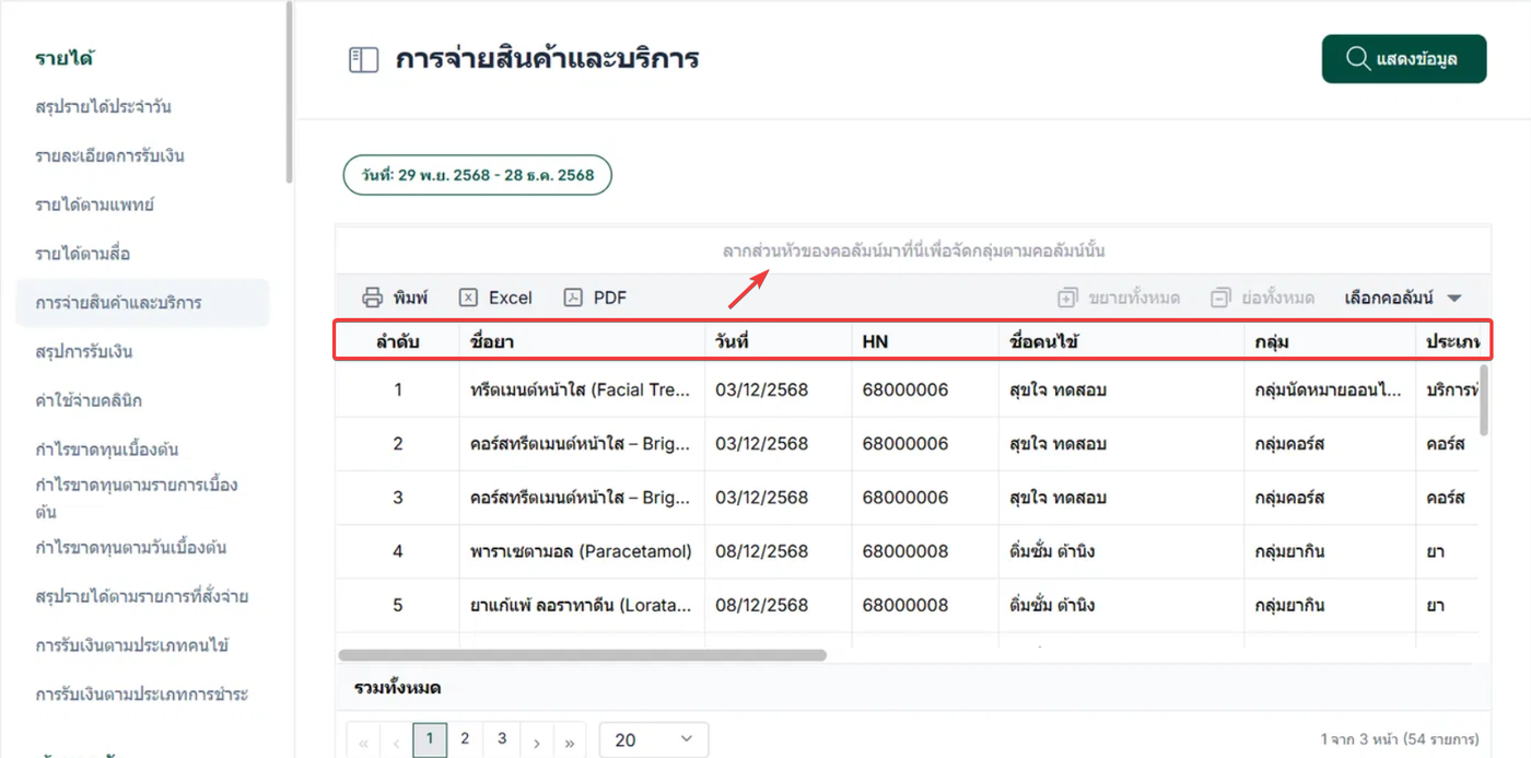 ผู้ใช้งานสามารถลากส่วนหัวของคอลัมน์เพื่อจัดตามกลุ่มของคอลัมน์ได้
