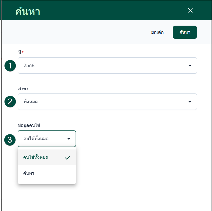 ข้อมูลคนไข้ สามารถเลือกค้นหา คนไข้ทั้งหมด หรือ ค้นหาเฉพาะเจาะจง