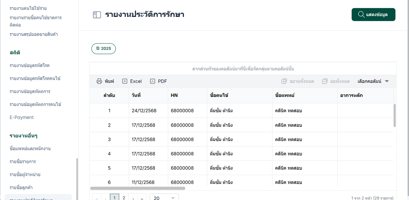 รายงานนี้ช่วยให้ผู้ดูแลระบบหรือเจ้าหน้าที่สามารถตรวจสอบและจัดการข้อมูลประวัติการรักษาคนไข้ที่คลินิกมีได้อย่างมีประสิทธิภาพ