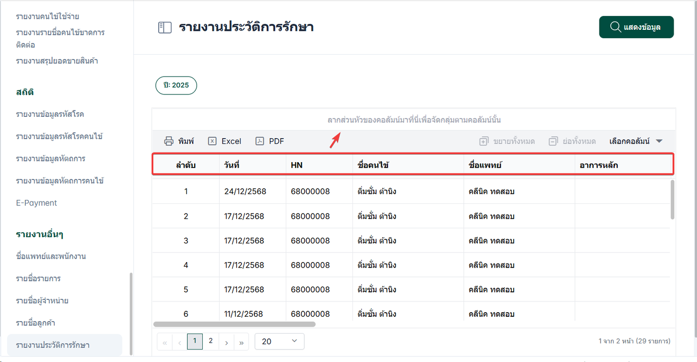 ผู้ใช้งานสามารถลากส่วนหัวของคอลัมน์เพื่อจัดตามกลุ่มของคอลัมน์ได้
