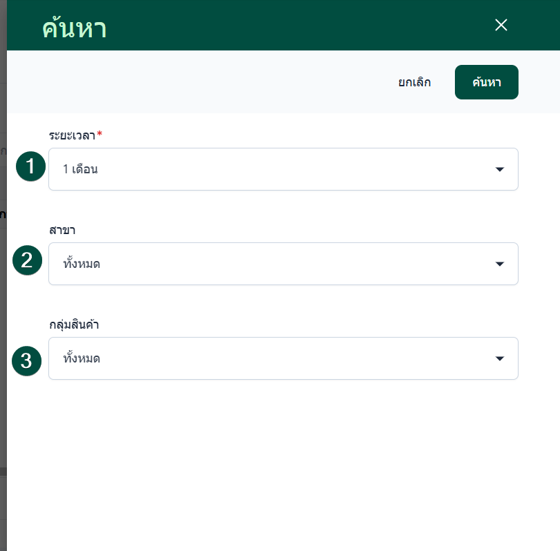 เมื่อกำหนดเงื่อนไขครบถ้วนแล้ว ผู้ใช้งานสามารถคลิก ค้นหา เพื่อแสดงผลรายงานตามข้อมูลที่เลือกไว้