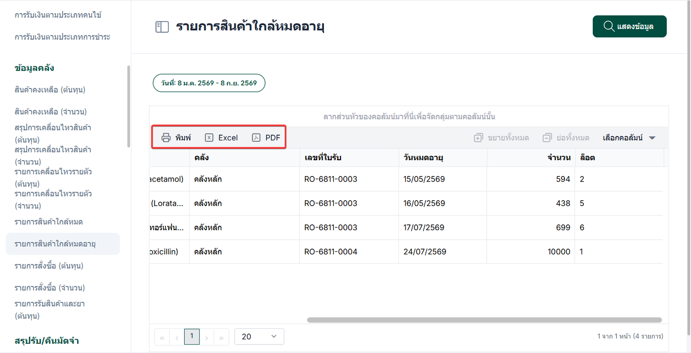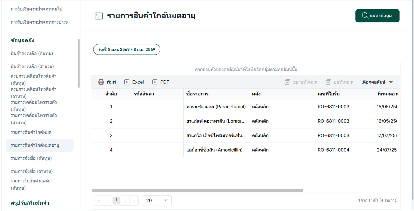 รายการสินค้าใกล้หมดอายุ คือรายงานที่ใช้สำหรับติดตามสินค้าที่มี อายุการเก็บรักษาเหลืออยู่น้อย หรือกำลังจะหมดอายุในช่วงเวลาที่กำหนด การจัดทำรายการสินค้าใกล้หมดอายุมีประโยชน์ในการตรวจสอบและเฝ้าระวังสินค้าที่ใกล้หมดอายุ รายงานนี้ช่วยให้ผู้ใช้งานสามารถบริหารสต็อกสินค้าได้อย่างมีประสิทธิภาพ และลดความเสี่ยงจากการใช้งานสินค้าที่หมดอายุ