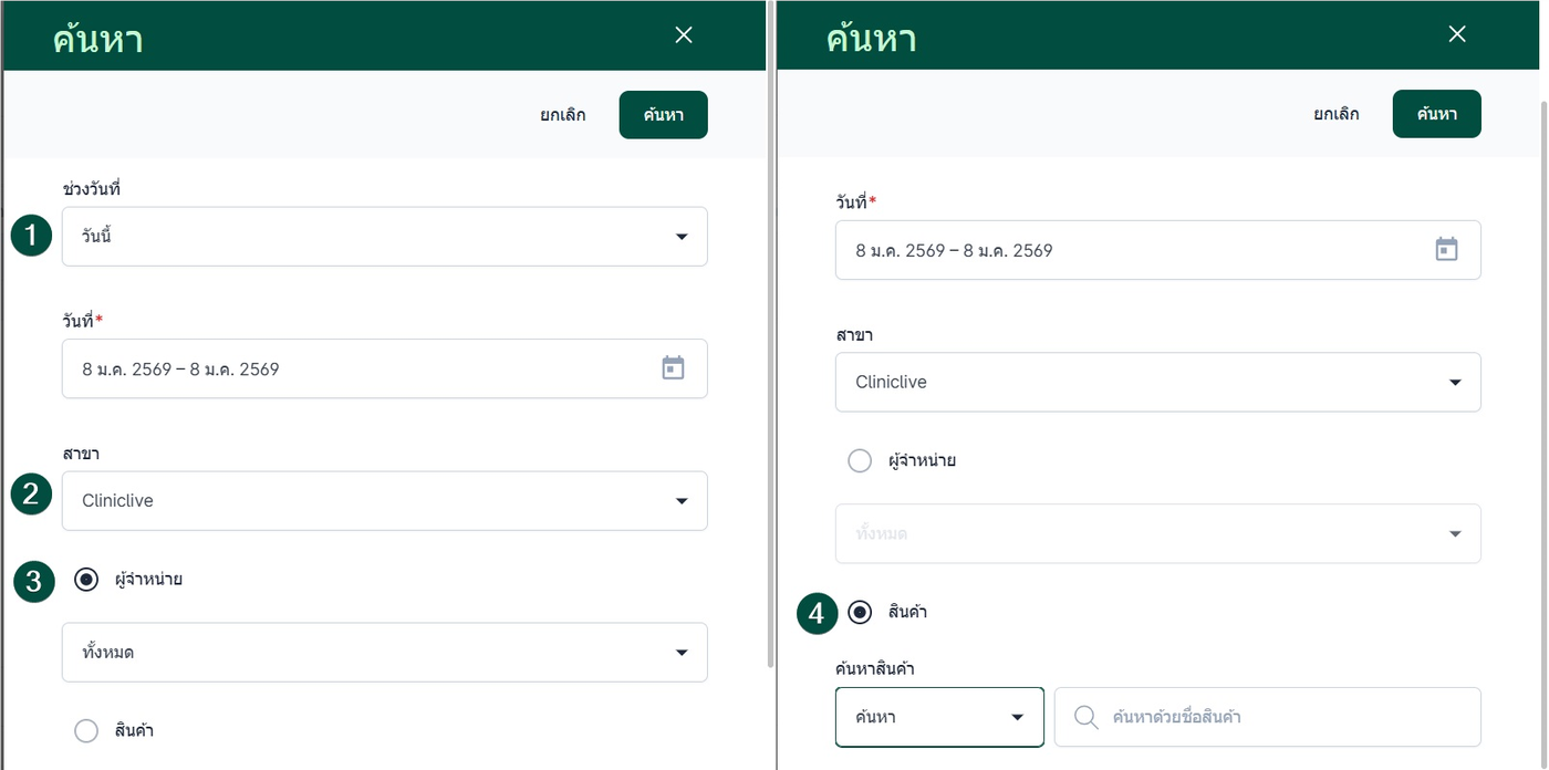 เลือกวันที่ ผู้ใช้งานสามารถเลือกช่วงวันที่ได้หลายรูปแบบ เช่น