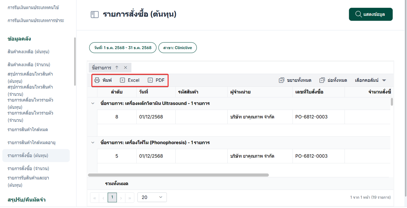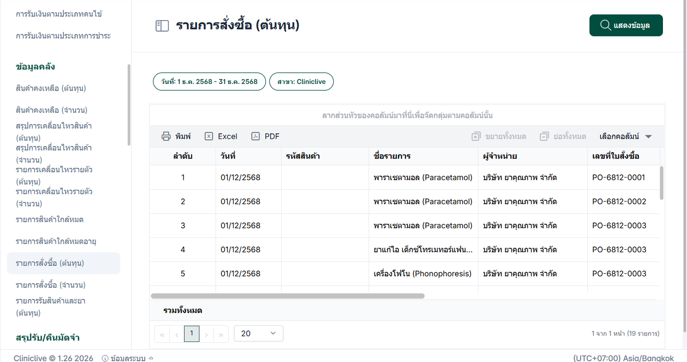 แสดงข้อมูลการสั่งซื้อในมุมมองด้าน มูลค่าและต้นทุน เช่น ราคาทุนต่อหน่วย จำนวนการสั่งซื้อ เป็นต้น