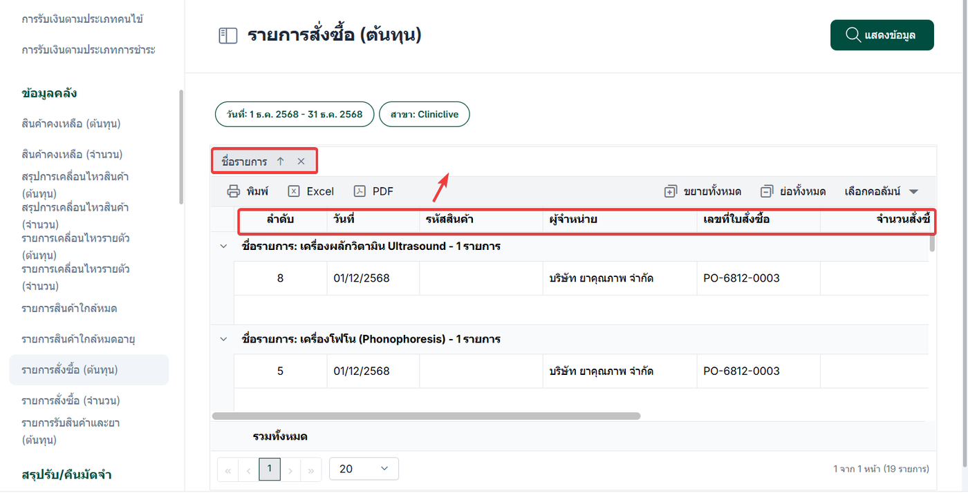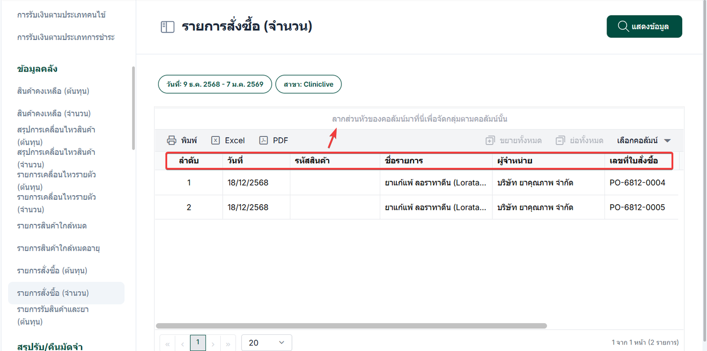 ผู้ใช้งานสามารถลากส่วนหัวของคอลัมน์เพื่อจัดตามกลุ่มของคอลัมน์ได้
