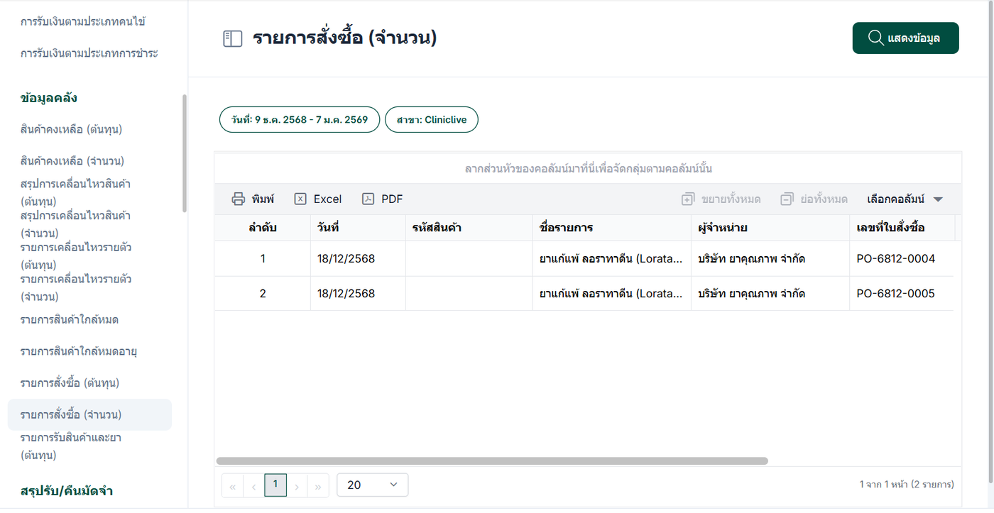แสดงข้อมูลการสั่งซื้อในมุมมองด้าน ปริมาณสินค้า เช่น จำนวนที่สั่งซื้อ หน่วย