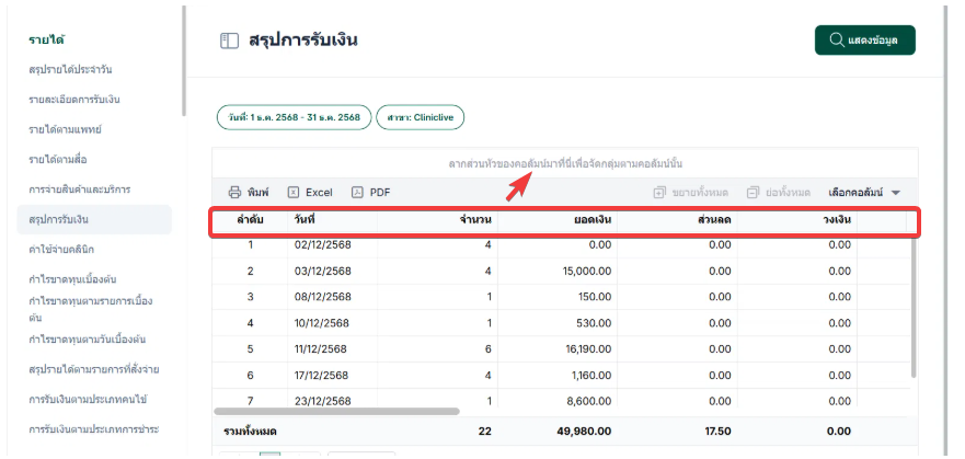 ผู้ใช้งานสามารถลากส่วนหัวของคอลัมน์เพื่อจัดตามกลุ่มของคอลัมน์ได้