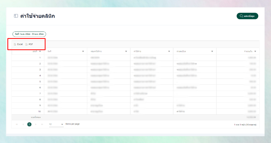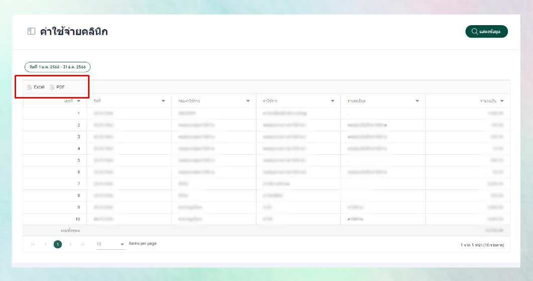 ค่าใช้จ่ายคลินิก ค่าใช้จ่ายคลินิกค่าใช้จ่ายคลินิก หมายถึง ค่าใช้จ่ายต่างๆภายในคลินิก เช่น ค่าน้ำ ค่าไฟ ค่าวัสดุอุปกรณ์ที่ใช้ในทางการแพทย์ เป็นต้น วิธีดูข้อมูลรายงานค่าใช้จ่ายคลินิกเลือกช่วงวันที่ วันที่ สาขา และกลุ่มเลือกค้นหา ระบบจะแสดงข้อมูลค่าใช้จ่ายคลินิก สามารถพิมพ์เอกสารออกมาได้เป็นไฟล์ Excel และ PDF