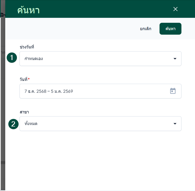 เลือกวันที่ ผู้ใช้งานสามารถเลือกช่วงวันที่ได้หลายรูปแบบ เช่น