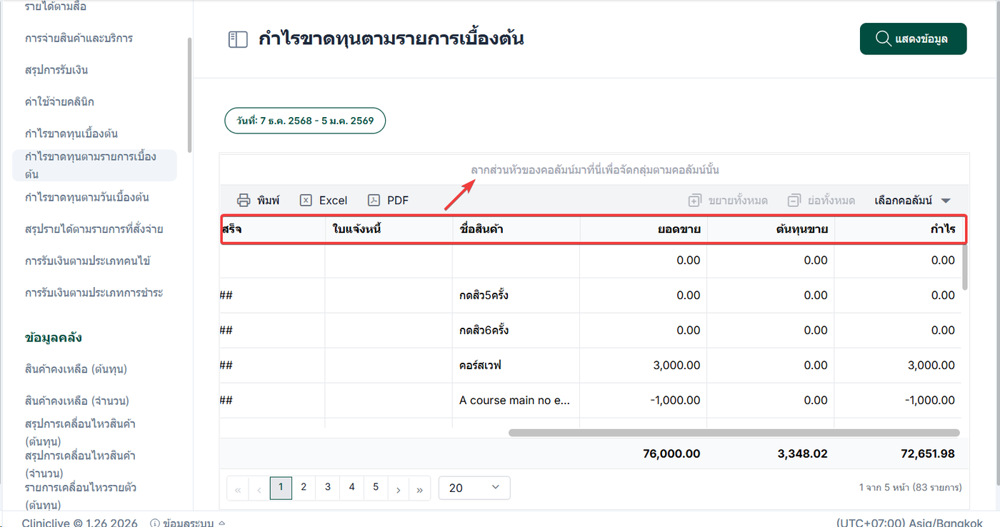 ผู้ใช้งานสามารถลากส่วนหัวของคอลัมน์เพื่อจัดตามกลุ่มของคอลัมน์ได้