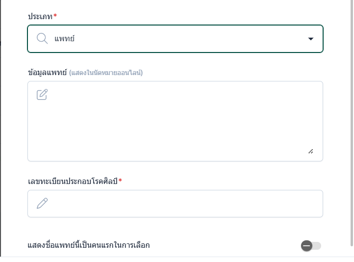 กรณีเลือกประเภทเป็นแพทย์ ระบบจะแสดงช่องกรอกข้อมูลเพิ่ม ประกอบไปด้วย