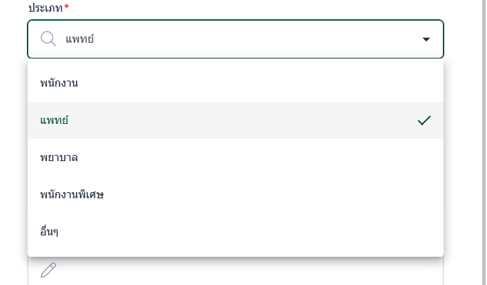 ประเภท: ประเภทพนักงานจะมีผลกับสิทธิ์การใช้งานระบบ เช่น แพทย์ จะสามารถกำหนดค่าตอบแทนการรักษาได้