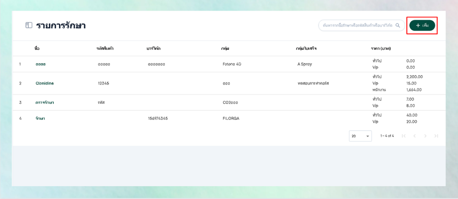 - ผู้ใช้งานจะเข้าสู่หน้าการรักษา จากนั้นกดที่ปุ่มเพิ่มทางด้านขวา