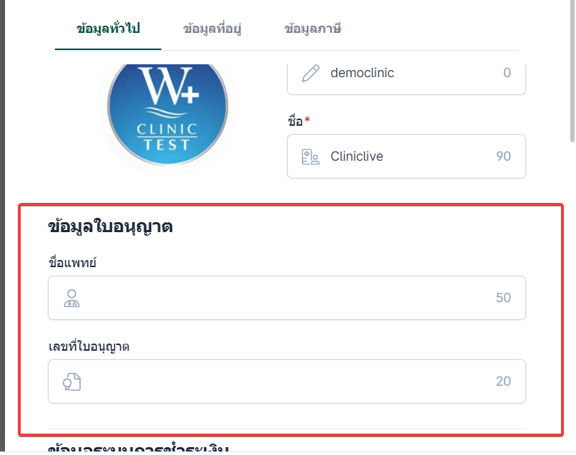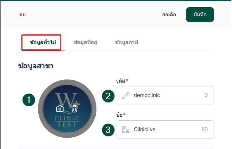 ข้อมูลที่อยู่สาขา กรอกข้อมูล เมื่อผู้ใช้งานพิมพ์เอกสารเช่นใบสร็จ ข้อมูลที่อยู่สาขานี้จะไปแสดงในใบเสร็จด้วย