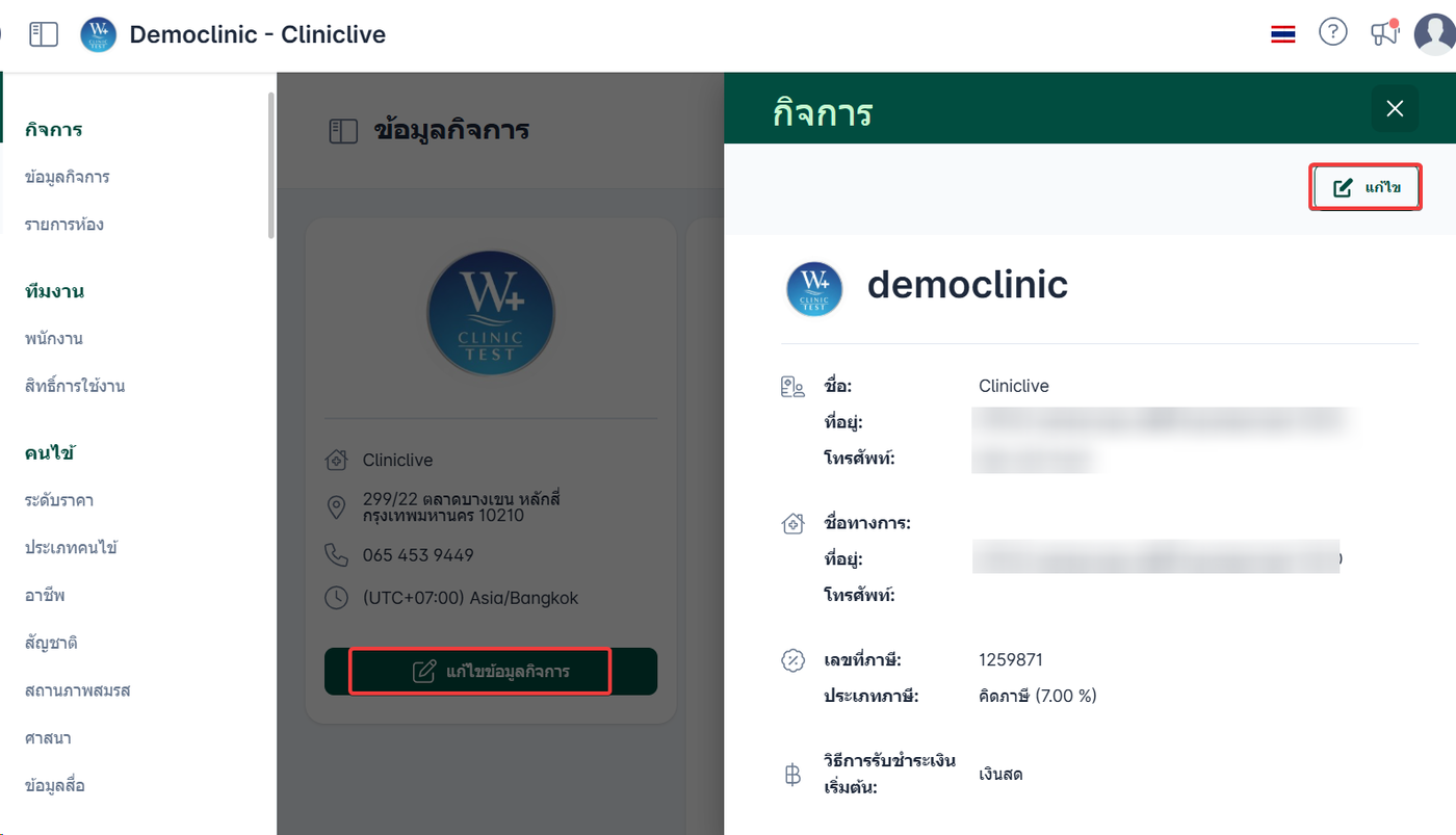 ผู้ใช้งานจะเข้าถึงหน้าข้อมูลกิจการ "เลือกแก้ไขข้อมูลกิจการ" จะมีหน้าต่างข้อมูลกิจการแสดงขึ้นมาจากนั้น เลือกที่ "แก้ไข"