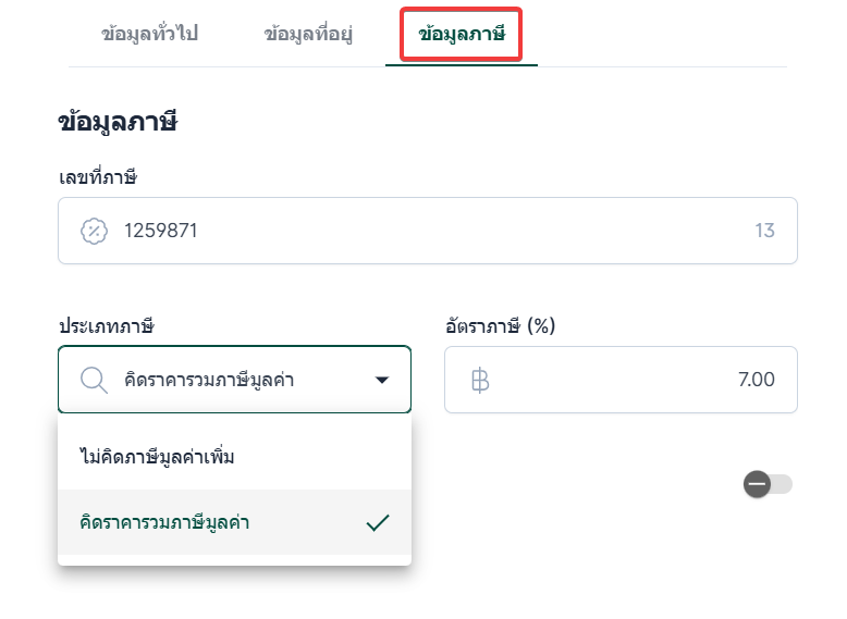 ประเภทภาษี ส่วนนี้สามารถเลือกได้ถ้าผู้ใช้งานเลือกไม่คิดภาษีมูลค่าเพิ่มจะไม่แสดงในช่องอัตราภาษี